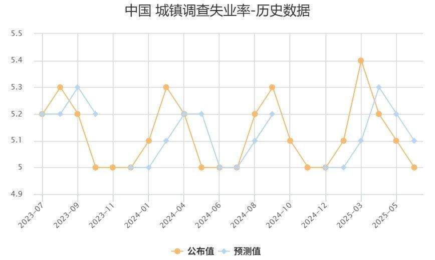 中国5月城镇调查失业率5%,好于预期!预期5.1%,前值5.1%