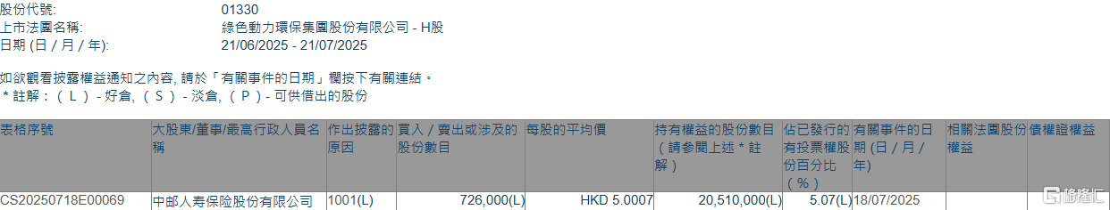 绿色动力环保(01330.HK)获中邮人寿保险增持72.6万股