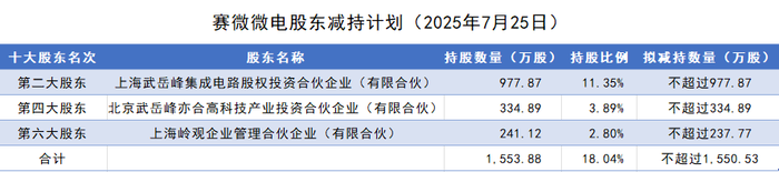 赛微微电第二大股东武岳峰投资及其一致行动人(发下简称“武岳峰系”)计划于2025年7月30日至2026年1月29日减持不超过1,550.53万股公司股份,约占总股本比例高达18%,减持方式为协议转让。公告称,受让方包括非关联第三方和二股东的关联主体。