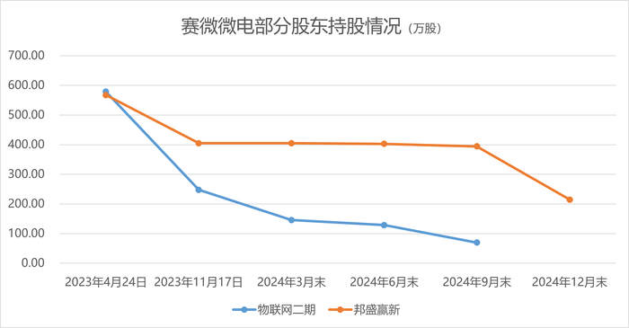 2023年4月25日,即赛微微电上市刚满一年,一年期限售股东上海物联网二期创业投资基金合伙企业(有限合伙)(以下简称“物联网二期”)和苏州邦盛赢新创业投资企业(有限合伙)(以下简称“邦盛赢新”)分别持股579.04万股和567.46万股,占比7.09%和6.95%,二者计划各减持总股本的5%。
