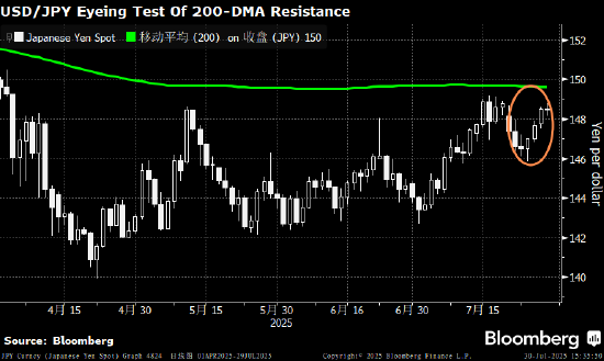 策略师们看跌日元,预计之前的参议院选举结果将推高政府支出,而美国关税的影响可能减缓日本央行的加息步伐。这种情绪与期权交易员的观点一致,他们也在为日元重拾跌势做准备。