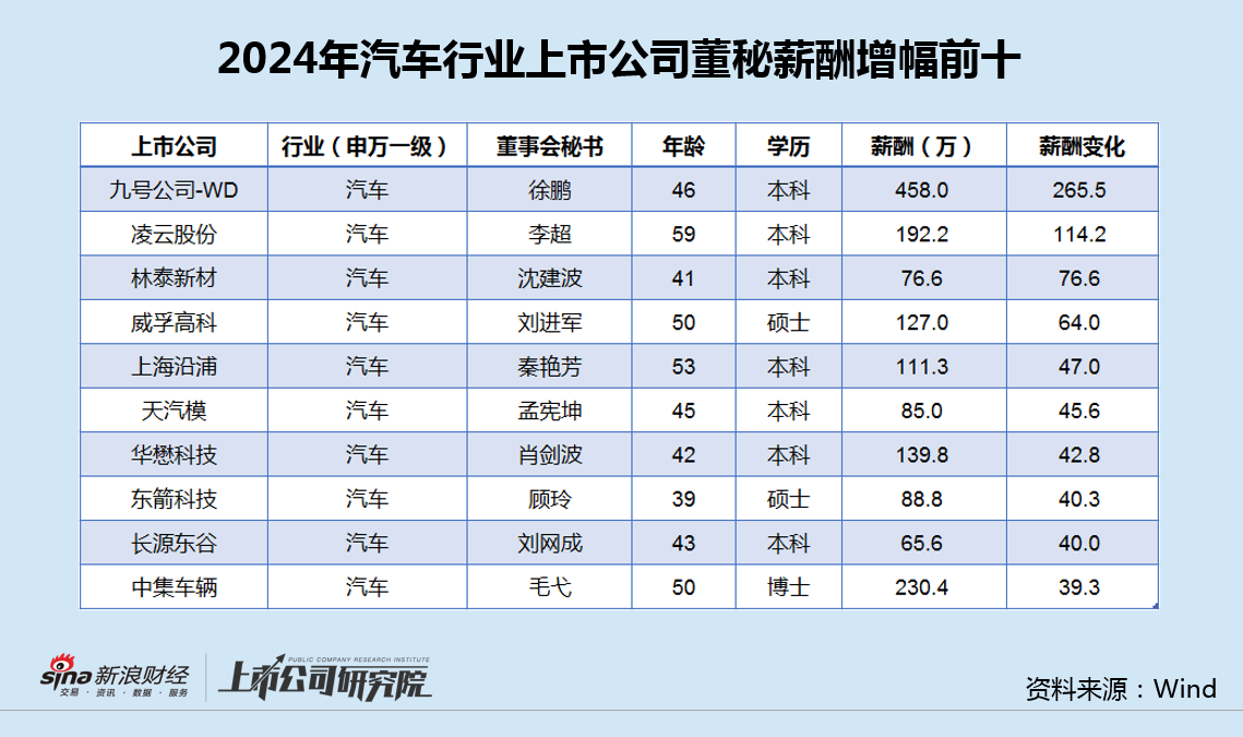 从董秘薪酬涨幅看,前10的上市公司分别为九号公司、凌云股份、林泰新材、威孚高科、上海沿浦、天汽模、华懋科技、东箭科技、长源东谷和中集车辆。