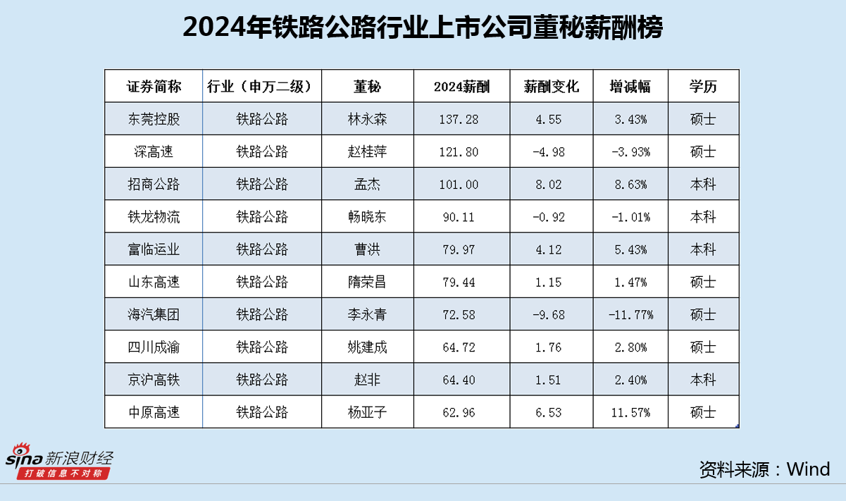 铁路公路行业董秘薪酬榜:东莞控股营收同比下滑64% 董秘林永森年薪涨至137万居首