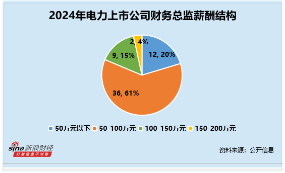 分行业来看,公用事业-电力行业(申万二级行业)上市公司财务总监CFO 2024年薪酬平均数约为74.38万元。其中薪酬最高为晶科科技刘晓军,2024年薪酬高达190.17万元;薪酬最低为*ST聆达(维权)谢景远,2024年薪酬为20.29万元(统计剔除了未完整领取2024年全年薪酬的财务总监CFO)。从整体薪酬分布来看,薪酬在50-100万元人数最多,共计36人,占比61%。