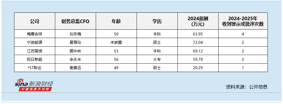 从违规情况来看,行业内共有5名财务总监CFO在2024-2025年收到过警示函、公开通报或内部通报的情况。