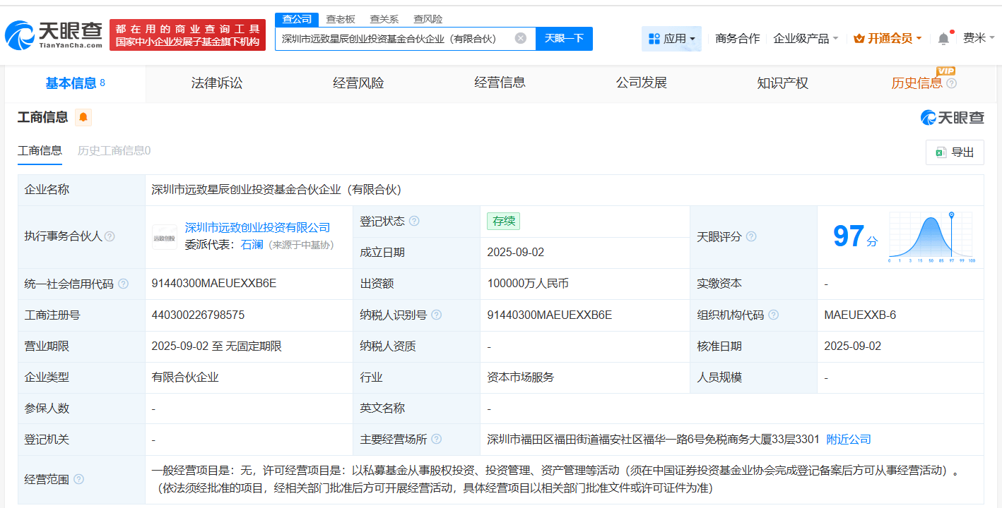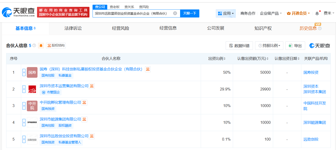 天眼查工商信息显示,近日,深圳市远致星辰创业投资基金合伙企业(有限合伙)成立,执行事务合伙人为深圳市远致创业投资有限公司,出资额10亿人民币,经营范围为以私募基金从事股权投资、投资管理、资产管理等活动。合伙人信息显示,该基金由国寿(深圳)科技创新私募股权投资基金合伙企业(有限合伙)、深圳市资本运营集团有限公司、中开院孵化管理有限公司、深圳市能源集团有限公司、深圳市远致创业投资有限公司共同出资。