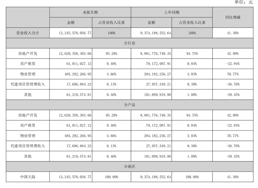 分业务来看,房地产开发业务的收入占比达95.28%,期内实现营业收入126.2亿元,同比增加42.09%。