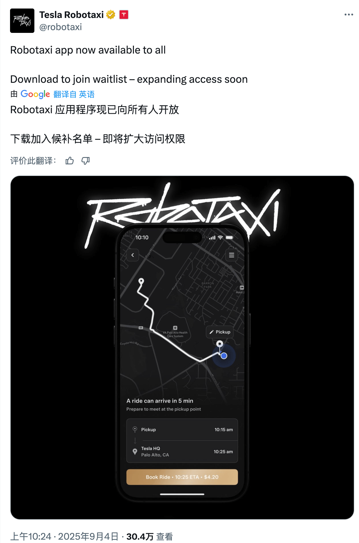 随后,特斯拉又发帖,附上了苹果应用商店的下载链接,称用户可通过下载应用加入候补名单。特斯拉自动驾驶出租车应用的公开上线与其CEO埃隆・马斯克(Elon Musk)此前预测的时间一致,即该应用将在9月面向公众开放。
