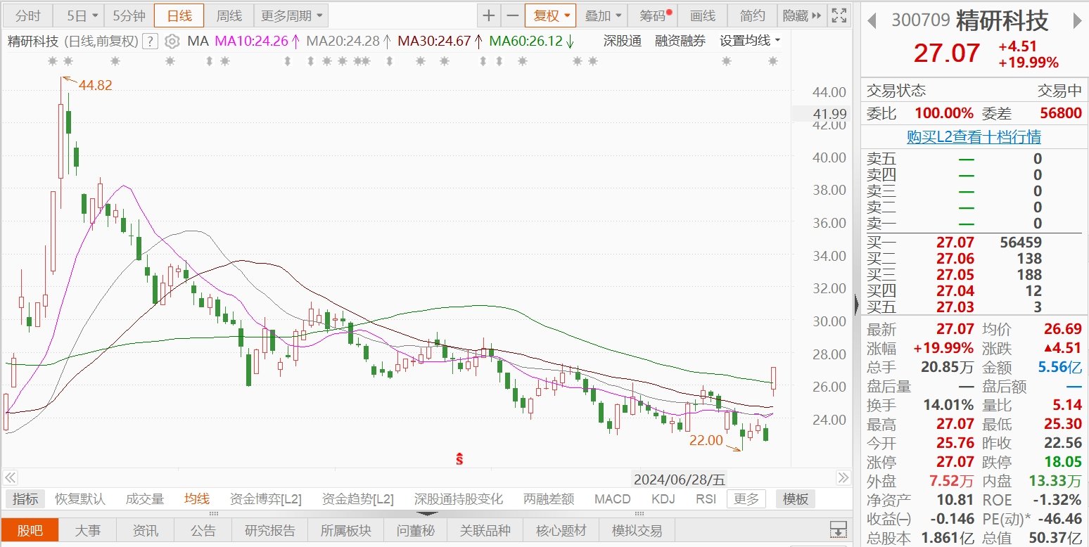 A股异动 | 精研科技20cm涨停 预计上半年净利5400万元―6100万元 同比扭亏
