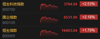 6月3日消息,港股三大指数集体高涨,截至收盘,恒生指数涨1.79%,报18403.04点,恒生科技指数涨2.53%,国企指数涨2.18%。盘面上,科网股普遍上涨,腾讯涨超4%,美团涨超3%,京东、小米、阿里、网易涨超2%;汽车股全天强势,广汽集团(601238)涨超6%,理想、比亚迪(002594)涨超5%;苹果概念股涨幅居前,比亚迪电子涨超7%;医药外包概念股逆势下跌,金斯瑞生物科技跌超17%。