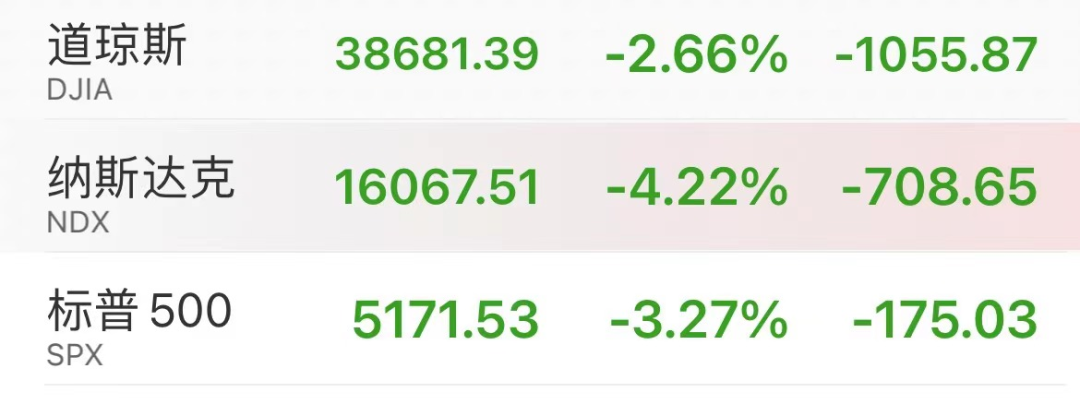 8月5日,美股三大股指集体低开。道指跌2.67%,纳指跌6.36%,标普500指数跌4.10%。截至发稿,三大股指跌幅收窄,道指跌2.66%,纳指跌4.22%,标普500指数跌3.27%。