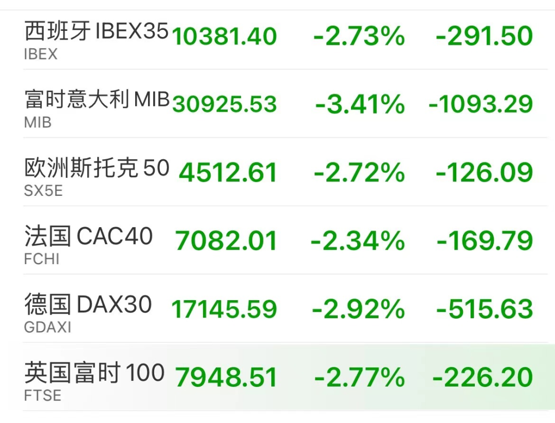 此外欧洲主要股指亦全线下跌。富时意大利MIB跌超3%,英国富时100、德国DAX30、法国CAC40、欧洲斯托克50、西班牙IBEX35均跌超2%。