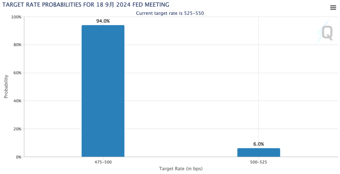 芝商所FedWatch工具显示,在非农就业数据公布以前,9月降息50bp的可能性仅为11.5%,而在上周日,这一概率骤升至70%。截至美股周一开盘,概率续升至94%。