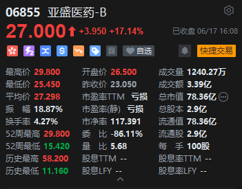 生物技术板块部分走强,亚盛医药涨超17%。消息面上,6月14日盘后,亚盛医药在港交所连发三份公告,内容涉及战略投资者入股,核心产品独家授权交易,以及拟赴美二次上市等利好消息,市场情绪受到提振。据亚盛医药公告,拟向Takeda International发行2430.73万股新股,相当于扩大后股本7.73%,禁售期一年;总代价7500万美元(约5.86亿港元),相当于每股作价24.0985港元,较6月14日收盘溢价4.55%;所得净额将用于核心产品、关键候选产品的开发。