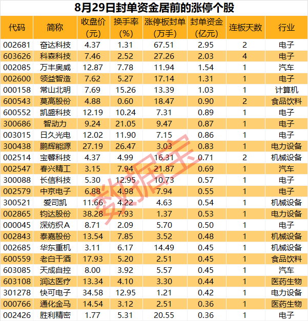 以封单金额计算,5股封单资金超亿元,奋达科技、科森科技、万丰奥威(002085)封单资金居前,分别为2.95亿元、2.03亿元、1.54亿元。