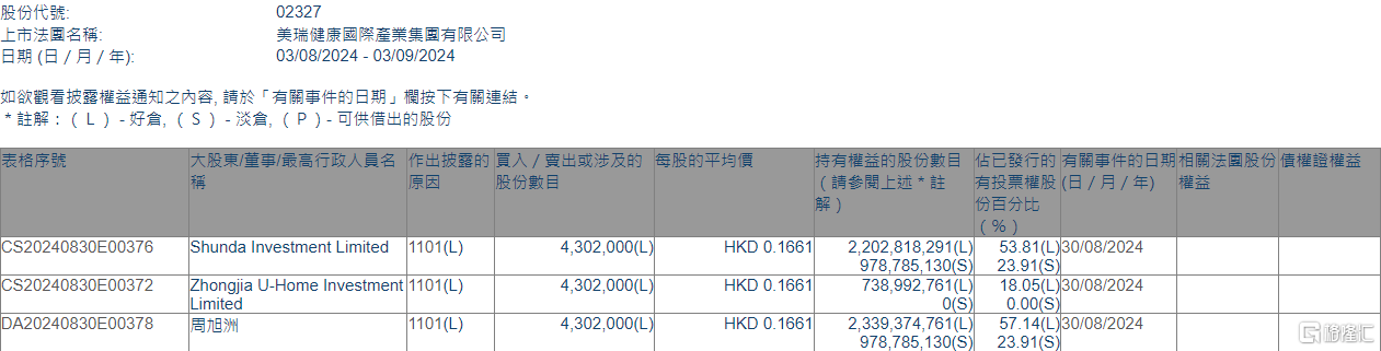 格隆汇9月3日丨根据联交所最新权益披露资料显示,2024年8月30日,美瑞健康国际(02327.HK)获执行董事周旭洲在场内以每股均价0.1661港元增持好仓430.2万股,涉资约71.5万港元。