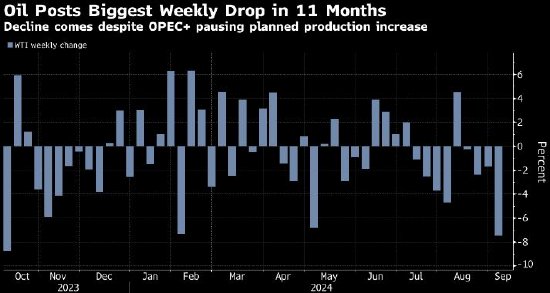 原油创11个月来最大单周跌幅,美国就业报告疲软加剧了市场对这个全球头号原油消费国需求平淡的担忧。
