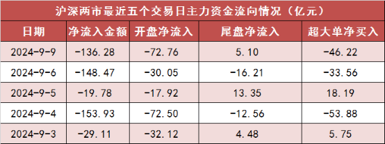 今日沪深两市主力资金开盘净流出72.76亿元,尾盘净流入5.1亿元,全天净流出136.28亿元。