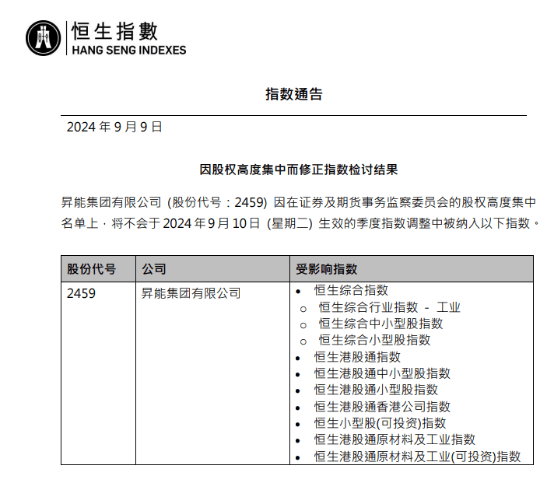 恒生指数公司9月9日发布“因股权高度集中而修正指数检讨结果”的指数通告显示,升能集团(股份代号:2459)因在证券及期货事务监察委员会的股权高度集中名单上,将不会于2024?9月10日(星期二)生效的季度指数调整中被纳入一些指数,包括恒生综合指数、恒生综合行业指数-工业、恒生综合中小型股指数、恒生综合小型股指数、恒生港股通指数、恒生港股通中小型股指数、恒生港股通小型股指数、恒生港股通香港公司指数、恒生小型股(可投资)指数、恒生港股通原材料及工业指数、恒生港股通原材料及工业(可投资)指数,这里面包含多个涉及港股通的指数。