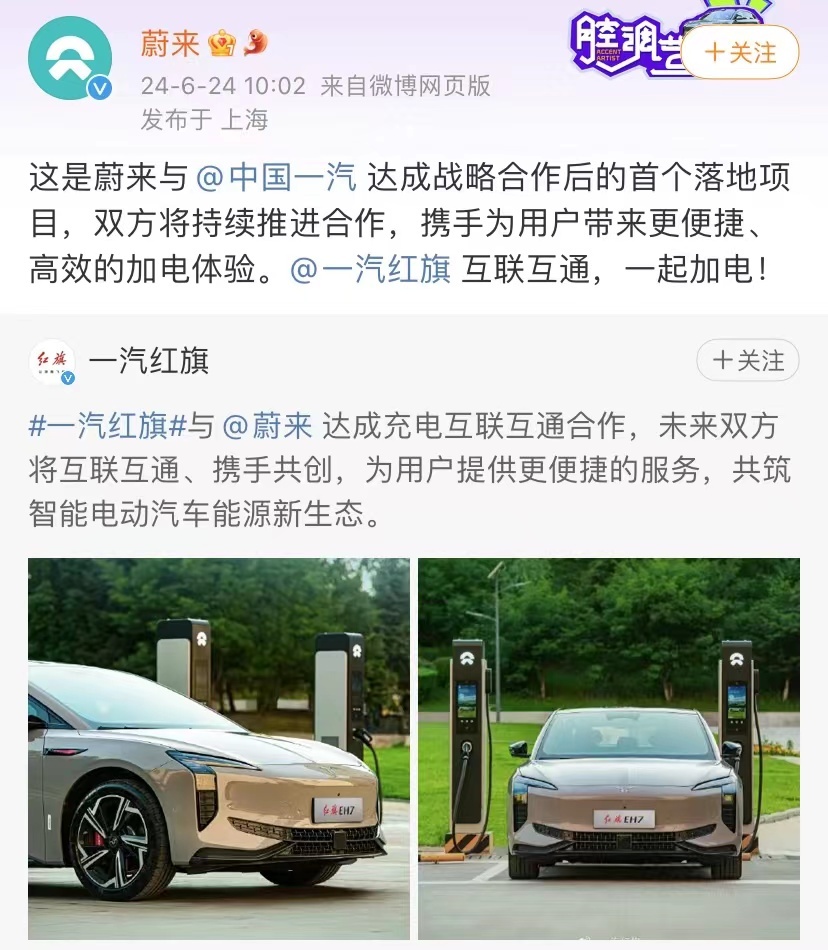凤凰网科技讯(作者/黄若曦)6月24日,蔚来汽车与一汽红旗达成充电互联互通合作。蔚来汽车发文表示,这是与中国一汽达成战略合作的首个落地项目,双方将持续推进合作,携手为用户带来便捷、高效的加电体验。
