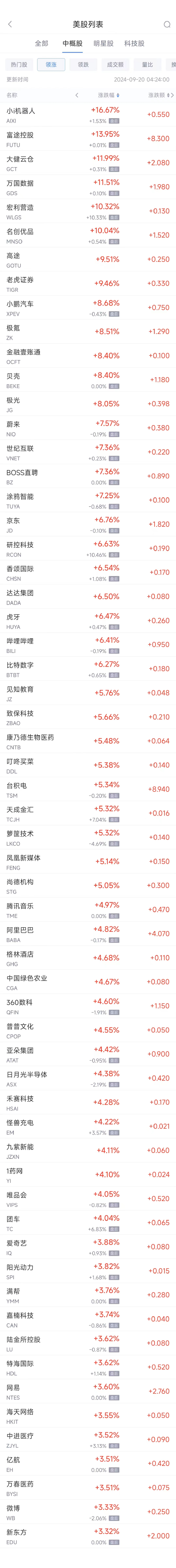 领涨中概股列表: