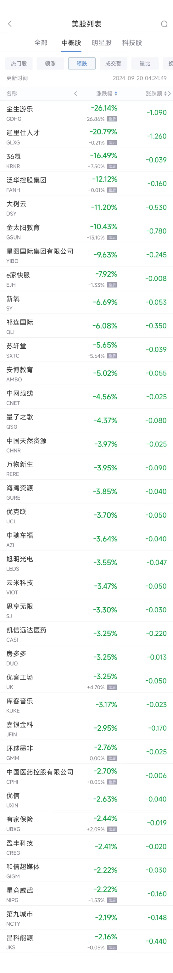 领跌中概股列表: