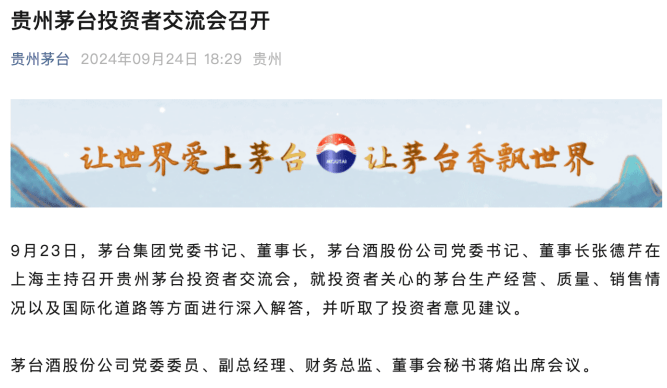 据贵州茅台官微9月24日消息,9月23日,茅台集团党委书记、董事长,茅台酒股份公司党委书记、董事长张德芹在上海主持召开贵州茅台投资者交流会,就投资者关心的茅台生产经营、质量、销售情况以及国际化道路等方面进行深入解答,并听取了投资者意见建议。