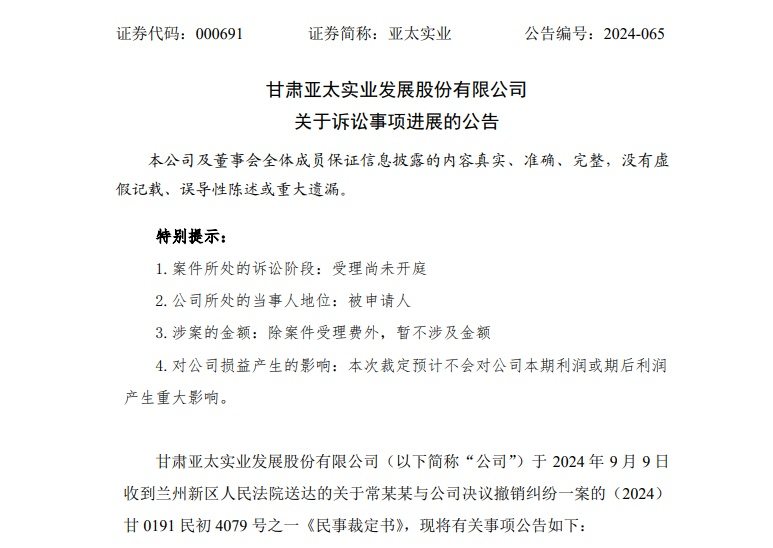早前,亚太实业于9月初披露,常某某作为持有公司41.95万股有效表决权的股东,向新区法院提起诉讼,要求判令撤销公司股东大会决议。上市公司对本案管辖权提出异议,但被新区法院驳回。