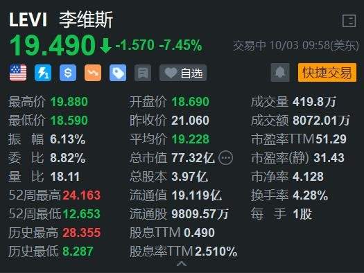 李维斯(LEVI.US)现跌7.45%,股价跌破20美元。消息上,公司正在考虑可能出售Dockers品牌,并预测第四季度营业收入不佳。