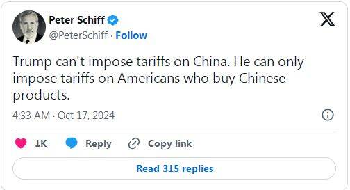 希夫在社交平台X上发帖批评了特朗普的关税政策,称“特朗普不能对中国征收关税。他只能对购买中国产品的美国人征收关税。”