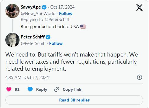 他进一步回应了一名主张将生产返回美国的用户,他说:“我们需要这样做。但关税不会让这种情况发生。我们需要降低税收,减少监管,尤其是在就业方面。”