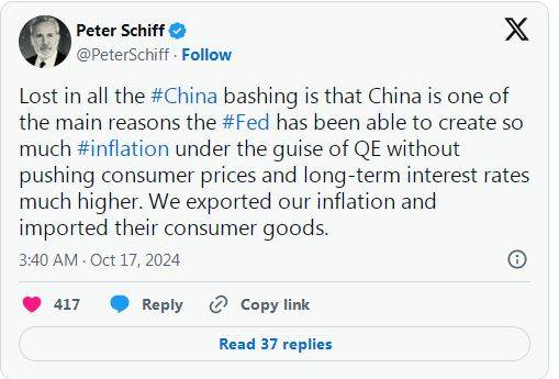 希夫还说,所有“抨击中国”人都忽略了一点,即中国是“(美联储)能够在QE的幌子下制造如此高的(通胀),而不会大幅推高消费者价格和长期利率的主要原因之一。我们输出了我们的通胀,进口了他们的消费品。”