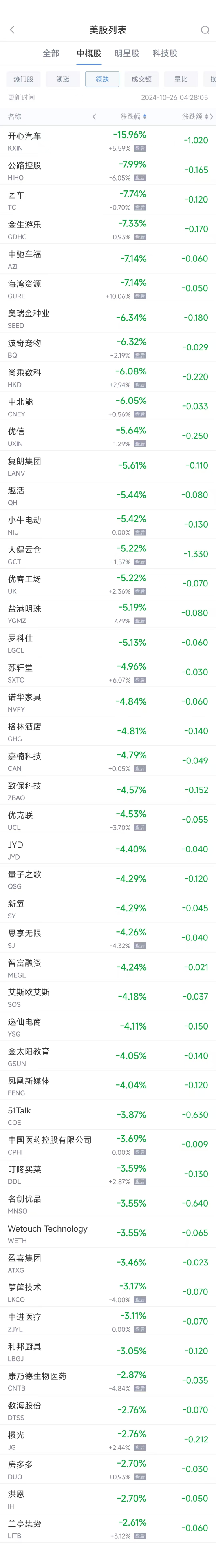 领跌中概股列表:
