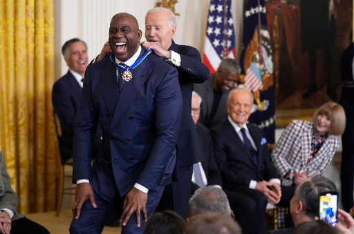 同样在获勋名单中的还有时尚界大咖拉尔夫・劳伦、U2 乐队主唱博诺,他们各自在专业领域发光发热,为文化、艺术发展添砖加瓦;演员迈克尔・J・福克斯克服身体不便,在助手协助下亮相舞台,展现坚韧精神;NBA 传奇 “魔术师” 约翰逊上台领奖时的一个小举动,蹲下身来配合颁奖,逗乐全场,为严肃的仪式增添轻松氛围。