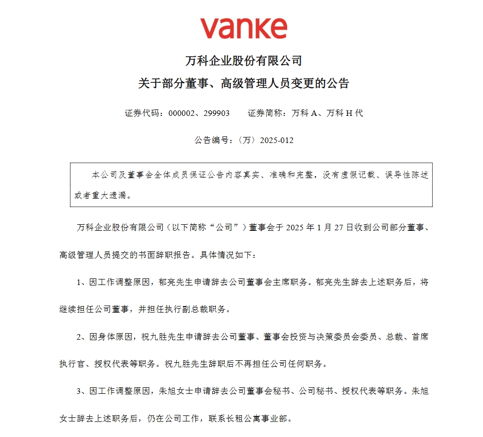 万科A公告,因工作调整原因,郁亮先生申请辞去公司董事会主席职务。郁亮先生辞去上述职务后,将继续担任公司董事,并担任执行副总裁职务。因身体原因,祝九胜先生申请辞去公司董事、董事会投资与决策委员会委员、总裁、首席执行官、授权代表等职务。祝九胜先生辞职后不再担任公司任何职务。