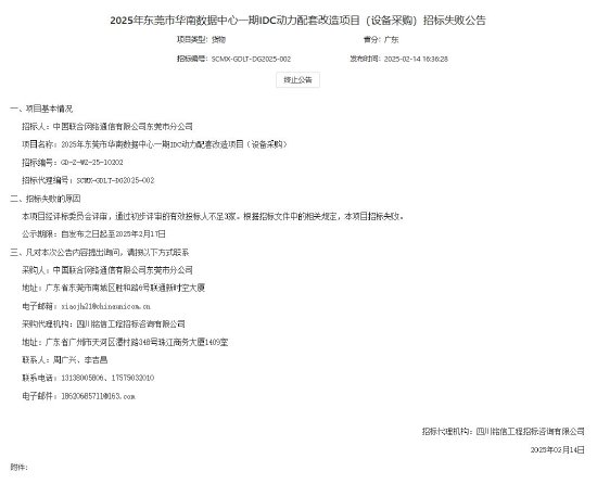 2月14日,中国联通发布《2025年东莞市华南数据中心一期IDC动力配套改造项目(设备采购)招标失败公告》。