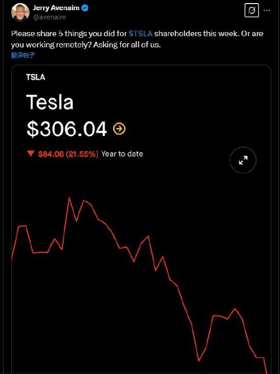 特斯拉投资者、美国名人摄影师杰里·阿芬纳姆(Jerry Avenaim)周三在X上写道:“请分享你本周为特斯拉股东做的五件事。”并附上了特斯拉股票表现不佳的图表,“或者你是远程工作?为我们所有的人问一下。”