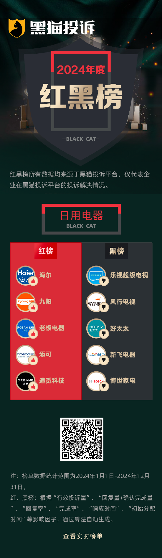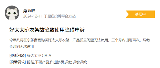 黑猫投诉发布2024年度日用电器领域红黑榜榜单:好太太晾衣架故障频发售后消极处理