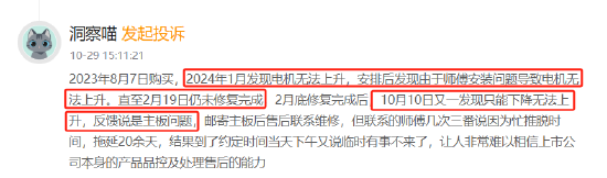 本年度黑猫投诉平台收到消费者投诉,反映好太太晾衣架产品故障频发且售后服务不佳。一位消费者于2024年1月发现电机无法上升,问题源于安装不当。虽于2月底修复,但10月10日又出现只能下降无法上升的故障,售后诊断为主板问题。尽管主板已邮寄,维修师傅多次以忙碌为由推脱,拖延20余天仍未完成维修。也有消费者称购买好太太晾衣架三个月内故障两次。消费者对好太太的产品质量及售后服务表示不满,认为其处理问题效率低下。建议遇到类似问题的消费者通过黑猫投诉平台维护自身权益。