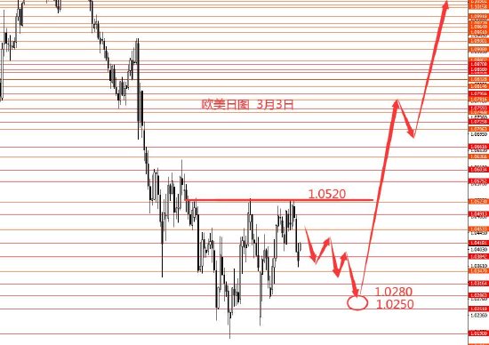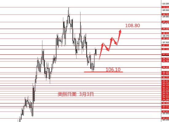 3月3日,美指上周正如预期106.10得以支撑向上反弹,周图收阳柱。从图形来看,美指从109.70跌下来这波行情已经走完,本月大概率小幅震荡向上,或者说区间震荡的概率较大些,关注区间106.10-108.80区间行情。本周操作建议:106.80附近做多,止损106.10,目标看向107.80和08.20,再看向108.50和108.80.控制仓量,严格止损。