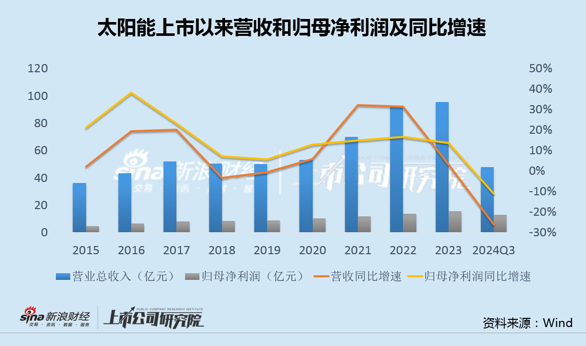2024年前三季度,太阳能实现营收47.73亿,同比下降25.93%,归母净利润12.91亿,同比下降10.95%,双双创下2015年借壳上市以来的最大降幅。