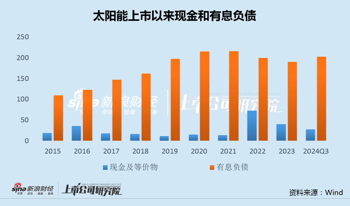 财报显示,截至2024年三季度末,太阳能长短期各类有息负债合计约202亿,相比2023年末增加6.3%,处于历史高位,与此同时公司账面现金仅28亿,相比2023年末大幅减少30%。