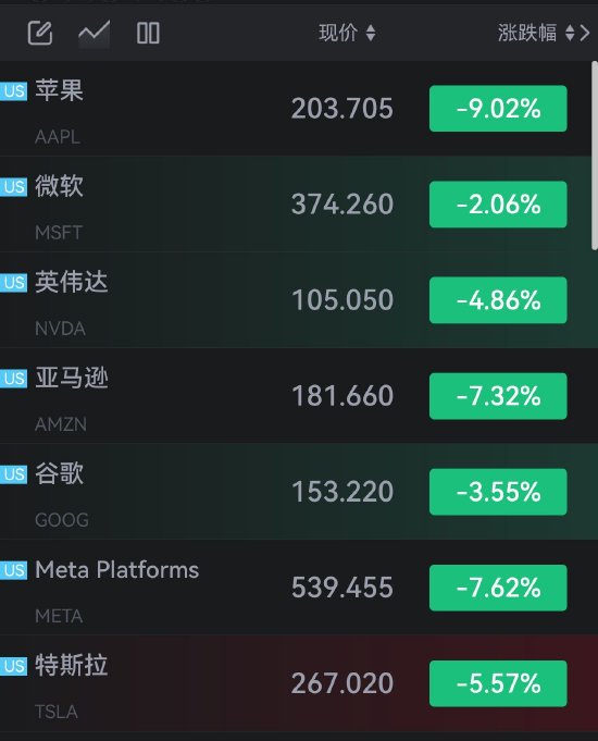 其中,苹果股价开盘下跌超8%,亚马逊、特斯拉、Meta、英伟达股价下跌超6%,谷歌股价下跌近4%。