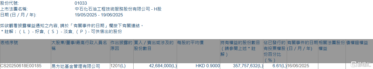 中石化油服(01033.HK)遭易方达基金减持4268.4万股