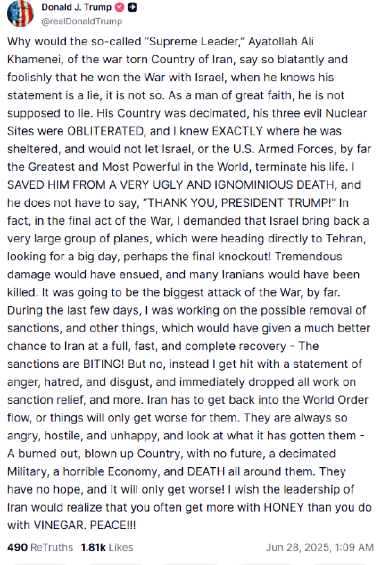 当地时间27日,美国总统特朗普表示,他曾研究解除对伊朗制裁的可能性,但在伊朗最高领袖哈梅内伊发表关于他们在与以色列战争中获胜的讲话后,他“放弃了所有放松制裁的工作”。