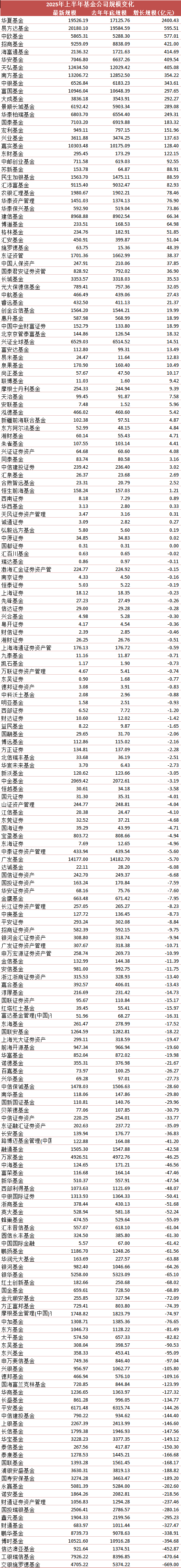 2025年上半年公募基金规模数据揭晓,在市场震荡中,头部基金公司凭借渠道与产品双重优势实现逆势扩张。wind数据显示,华夏基金以绝对增量称王,中欧基金则以黑马姿态展现惊人增速,而易方达、南方等万亿巨头增速相对放缓;苏新基金、东财基金等中小机构因为基数小,以超70%增速逆袭,行业格局正加速重构。