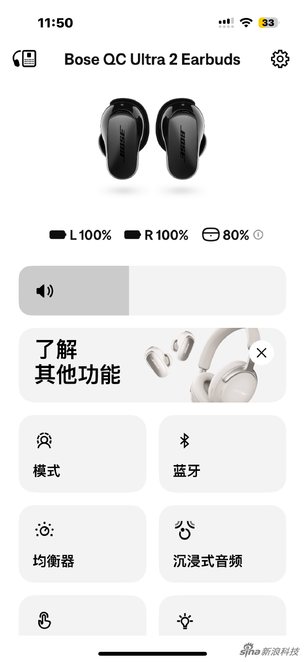 使用兼容的第三方充电器就能为充电盒充电,充完后,在沉浸式音频设置为关闭的情况下,可为耳机供电6小时。同时,一定要下载同步的Bose APP,便于查看充电盒的电池电量报告,比如当左右耳塞电量差超过 15% 时,语音提示会优先播报低电量侧。