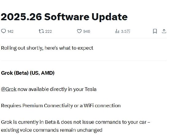 Grok目前处于测试阶段,不会向车辆发送指令——现有的语音指令保持不变