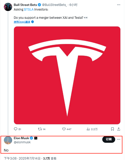 社交平台 X 上的账号 @BullStreetBets_向特斯拉投资者发布了一个公开问题,询问他们是否支持特斯拉与 xAI 合并。马斯克回复 “不支持”。