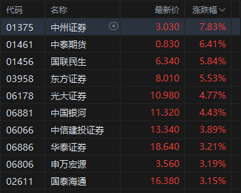 中资券商股活跃,中州证券涨超7%。中泰证券表示,持续看好券商板块的相对收益机会,重申板块投资逻辑。建议关注:1)头部券商;2)充分受益于市场交投活跃的金融科技龙头。